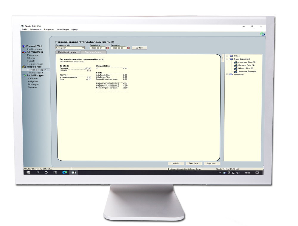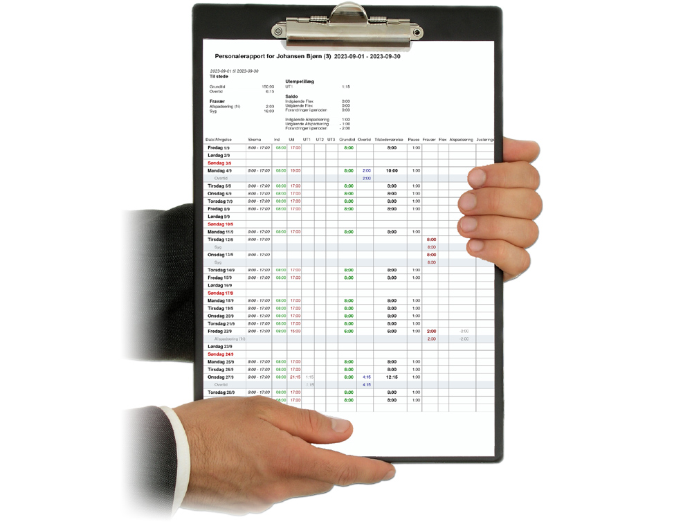 Systemet indeholder også specificering af fravær. Dermed kan al data til lønkørsel automatisk genereres for hver enkelt ansat.